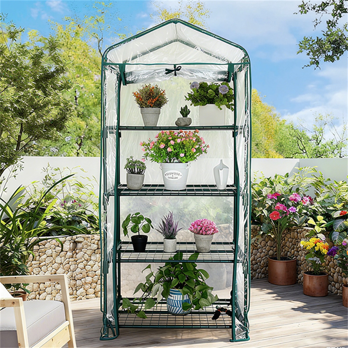 INDOOR & OUTDOOR - The portable greenhouse is ideal for both indoor and outdoor use on your porch, patio, deck, or sunroom. The cover has a zippered roll-up door that protects plants from frost or pests to create an ideal growing environment.