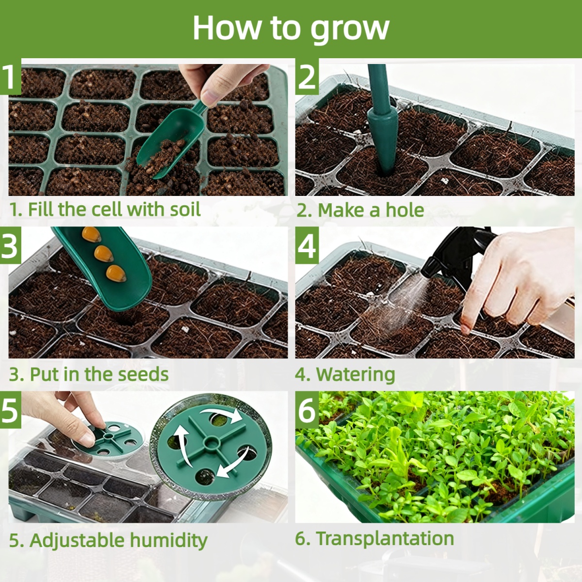 The seed starter kit comes with multiple seed starting trays—each cell is optimized to a 1.5-inch square, providing ample growth space for large-seed plants (tomatoes, potatoes, peppers, eggplants) and small-seed plants (flowers, herbs). These plant germination trays combined match the capacity of a standard 120 flat tray.